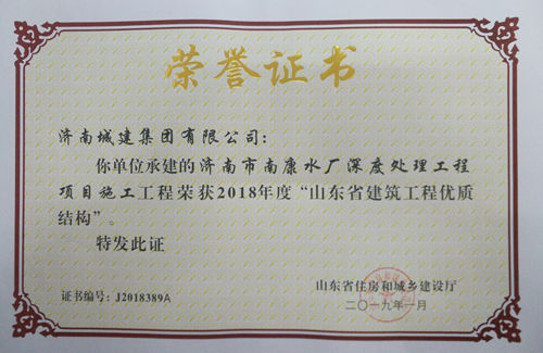济南市南康水厂深度处理工程项目施工工程被评为2018年度“山东省建筑工程优质结构”