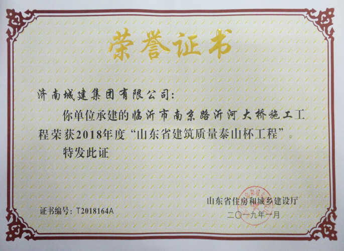 临沂市南京路沂河大桥施工工程被评为2018年度“山东省建筑质量泰山杯工程”