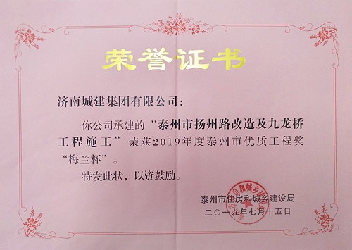 泰州市扬州路及九龙桥工程施工被评为2019年度泰州市优质工程奖”梅兰杯“