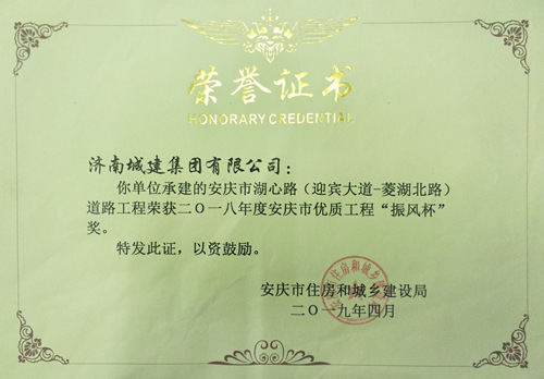 安庆市湖心路(迎宾大道-菱湖北路)道路工程被评为2018年度安庆市优质工程“振风杯”奖