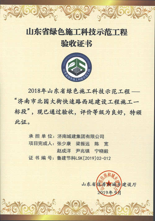 济南市北园大街快速路西延建设工程施工一标段被评为2018年山东省绿色施工科技示范工程