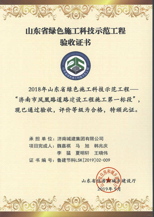 济南市凤歧路道路建设工程施工一标段被评为2018年山东省绿色施工科技示范工程